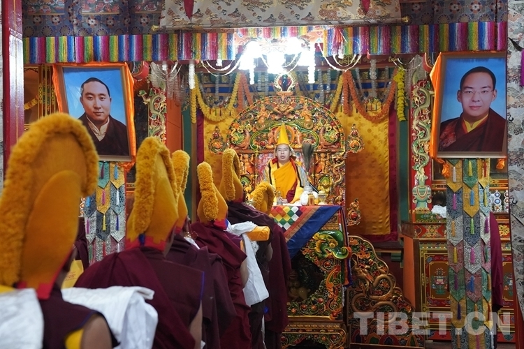 當日的拉定寺裝飾一新,班禪一行抵達后,現(xiàn)場法號齊鳴、法螺合奏,倫珠晉巴和僧眾在寺廟前舉行了隆重的歡迎儀式。隨后,在手持香爐、寶傘高僧的引導護送下,班禪步入主殿上寶座,向寺廟僧眾傳授《三主要道論》,為僧眾摸頂賜福、發(fā)放布施。