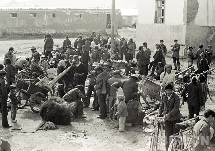 昔日那曲鎮(zhèn)露天市場(chǎng),牧民群眾正在售賣現(xiàn)場(chǎng)宰殺的新鮮牦牛肉(唐召明1987年攝)