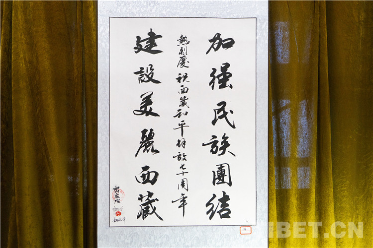 圖為扎什倫布寺僧人所書寫的“加強(qiáng)民族團(tuán)結(jié) 建設(shè)美麗西藏”漢字書法 攝影:趙振宇