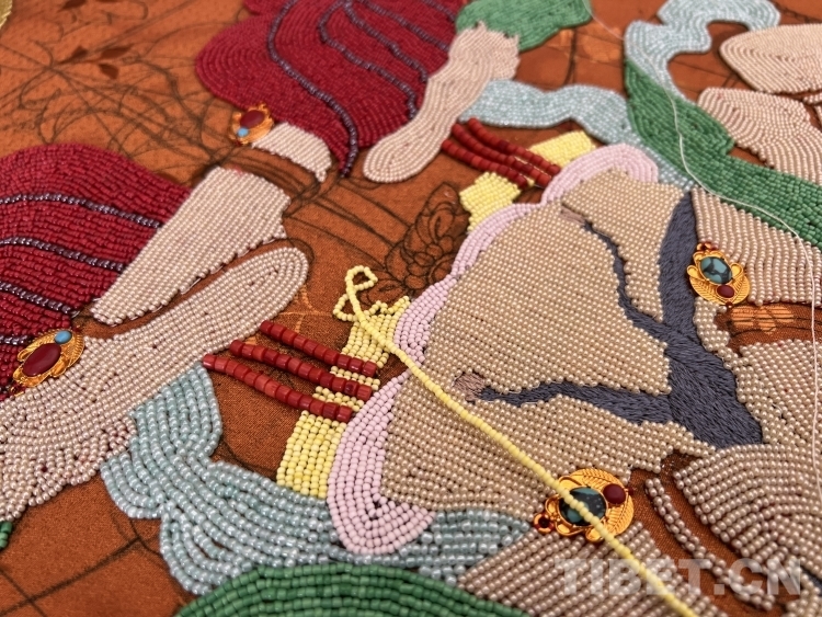 掌握了藏繡技藝,夫妻二人有了新的發(fā)展目標。在傳承和發(fā)展傳統(tǒng)堆繡技藝的同時,土旦想要創(chuàng)新更有特色的藏繡作品,于是創(chuàng)作“珍珠唐卡”的想法在他腦海中萌生?!爸韵胍獎?chuàng)作珍珠唐卡,是因為有次我在山南的昌珠寺看到了‘觀世音菩薩憩息圖’這幅珍珠唐卡,我被它精美絕倫的制作工藝深深吸引,心想自己從事堆繡創(chuàng)作多年,也應該去嘗試制作‘珠繡’作品了?!蓖恋┫蛴浾咧v述了他與珍珠唐卡的“結(jié)緣”經(jīng)歷。