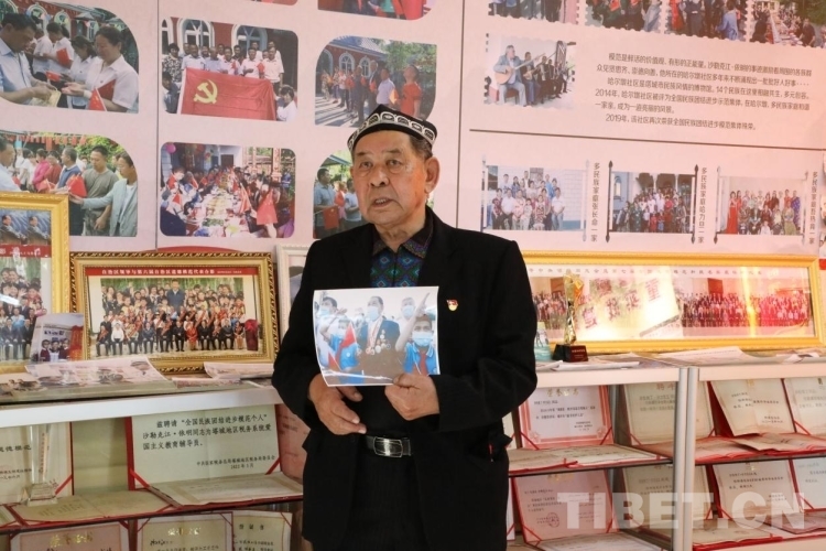 在講述故事的時候,沙勒克江·依明老人總是把腰背挺得直直的,雙眼的目光有神而堅(jiān)定,說話吐詞帶有重音和落地實(shí)感。當(dāng)他拿起照片,講起自己觀看天安門廣場的升旗儀式時,他會用腳一聲一聲地踏出聲音,沉浸描述當(dāng)時國旗班的腳步聲帶給他的心靈震撼。而隨著他的動作,我們的身心也顫抖了起來。