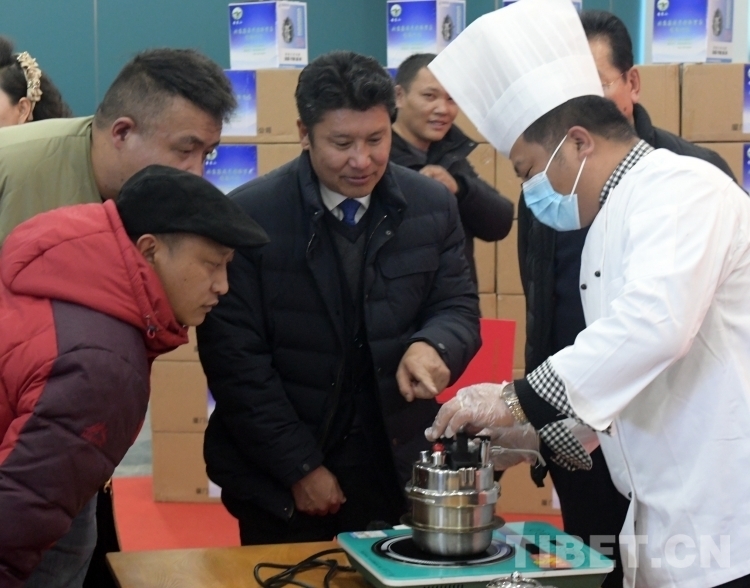 那曲市委常委、常務(wù)副市長白瑪羅布(中)在捐贈(zèng)活動(dòng)現(xiàn)場,觀看高原節(jié)能鍋的使用演示(唐召明2023年12月26日攝)