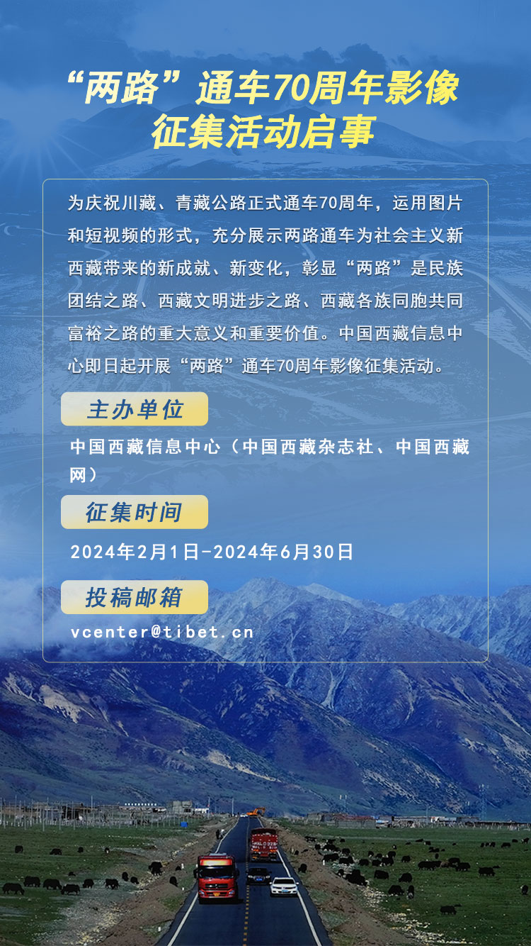 為慶祝川藏、青藏公路正式通車70周年,運(yùn)用圖片和短視頻的形式,充分展示兩路通車為社會主義新西藏帶來的新成就、新變化,彰顯“兩路”是民族團(tuán)結(jié)之路、西藏文明進(jìn)步之路、西藏各族同胞共同富裕之路的重大意義和重要價(jià)值。中國西藏信息中心即日起開展“兩路”通車70周年影像征集活動(dòng)。