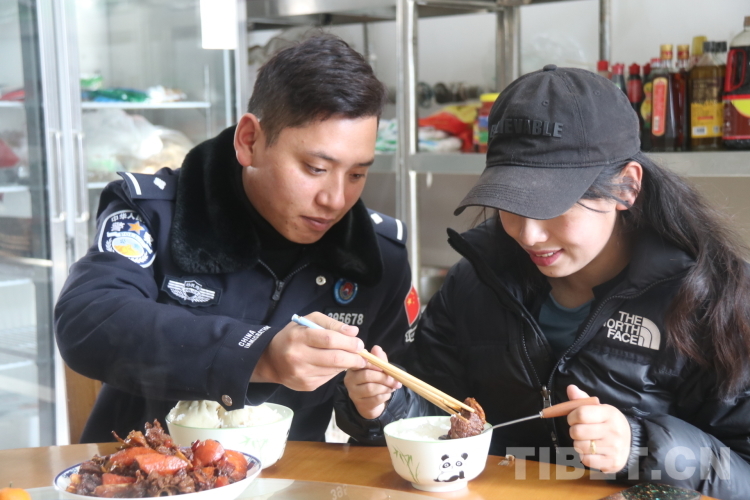 氧氣瓶、高原藥品、熱水......接德吉永措的車上已準(zhǔn)備好了各種抗高反和取暖的東西,這讓她提前感受到了來自丈夫單位的熱情與關(guān)懷。與愛人相聚后,旦增洛追帶著妻子參觀營區(qū),迫切地想讓她了解他用青春為之奮斗的警營,隨后他又帶著妻子到單位食堂品嘗自己親自下廚做的紅燒肉?!班?!味道很好。”德吉永措吃著丈夫給她夾的肉,臉上洋溢著幸福的笑容。