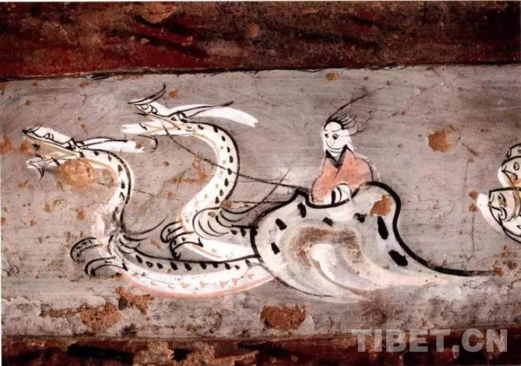 圖為陜西靖邊縣郝灘漢墓壁畫:駕雙龍之車遨游天國(guó)圖,距今約2000年。