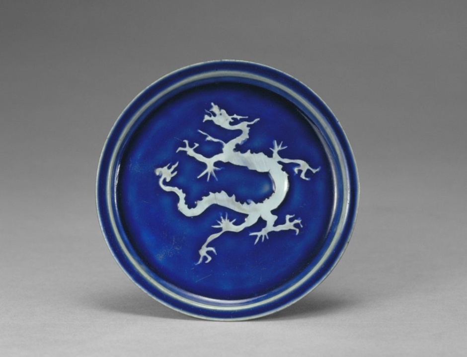 藍(lán)釉白龍紋折沿盤,高1.1厘米,口徑16厘米,足徑14厘米。盤折沿,淺壁,平底。盤內(nèi)外施藍(lán)釉,釉色純凈明亮,猶如藍(lán)寶石般晶瑩、光彩奪目。內(nèi)底在藍(lán)釉地上以泥料塑貼一條矯健的白龍。龍細(xì)頸,三爪,作昂首翻騰狀。此盤為元代景德鎮(zhèn)窯燒造,可能是配合酒盞使用的托盤。