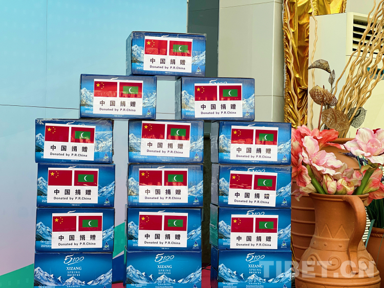 圖為西藏自治區(qū)向馬爾代夫捐贈的“西藏好水” 攝影:德吉卓瑪