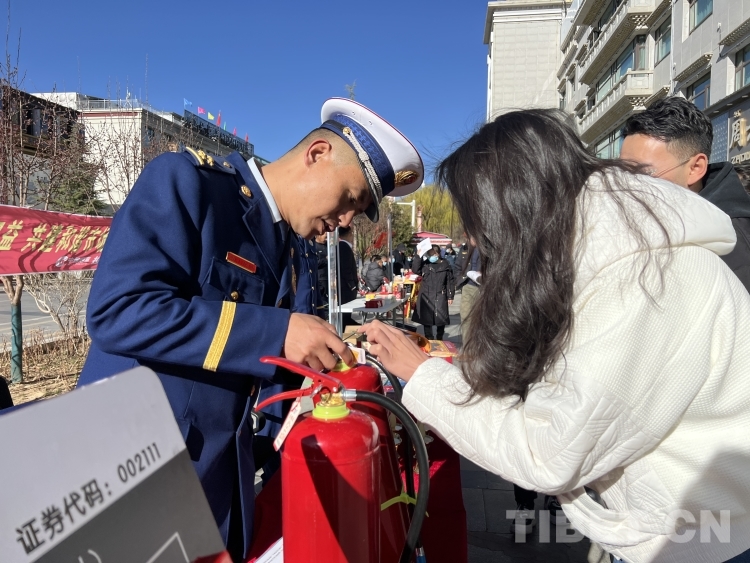 圖為活動(dòng)現(xiàn)場(chǎng)拉薩市消防支隊(duì)工作人員向來(lái)往市民講解如何使用滅火器 攝影:德吉卓瑪