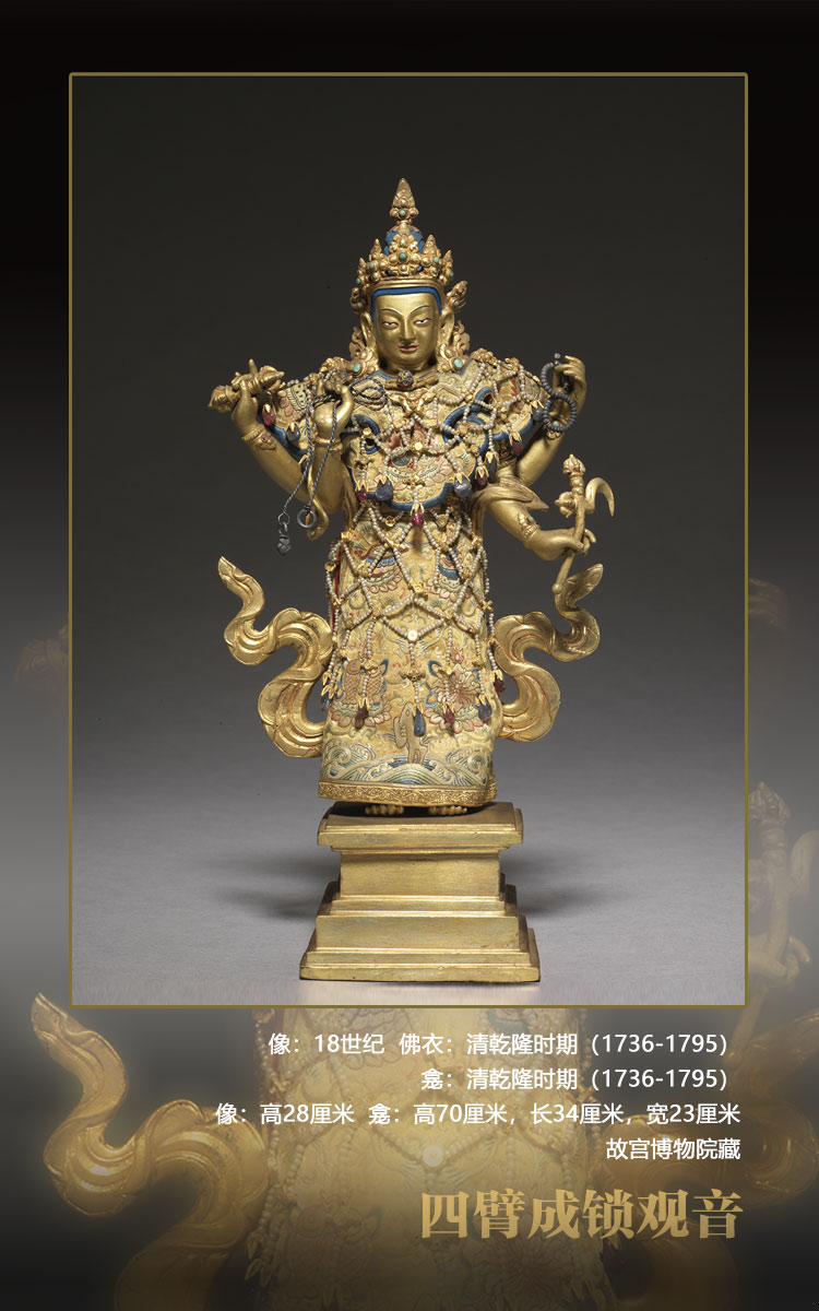 成鎖觀音,即不空羂索觀音。觀音一面四臂,分別持羂索、金剛杵、念珠、金剛鉤,在現(xiàn)在的圖像里很少找到持物相同的造像,可能是特別的傳承。觀音立姿站于方形臺(tái)座上。因其所著佛衣未曾打開(kāi),故造像身體裝飾情況不清。佛衣為清宮配做,繡工精細(xì),上綴串珠瓔珞,極具宮廷風(fēng)格。另有清宮配做紫檀木重檐亭式玻璃門佛龕,龕背面陰刻四體文題記,漢文為:“乾隆三十七年十二月十二日,欽命阿旺班珠爾胡土克圖認(rèn)看供奉大利益扎什璃瑪四背成鎖觀世音菩薩?!薄八谋场奔础八谋邸钡恼`書(shū)。