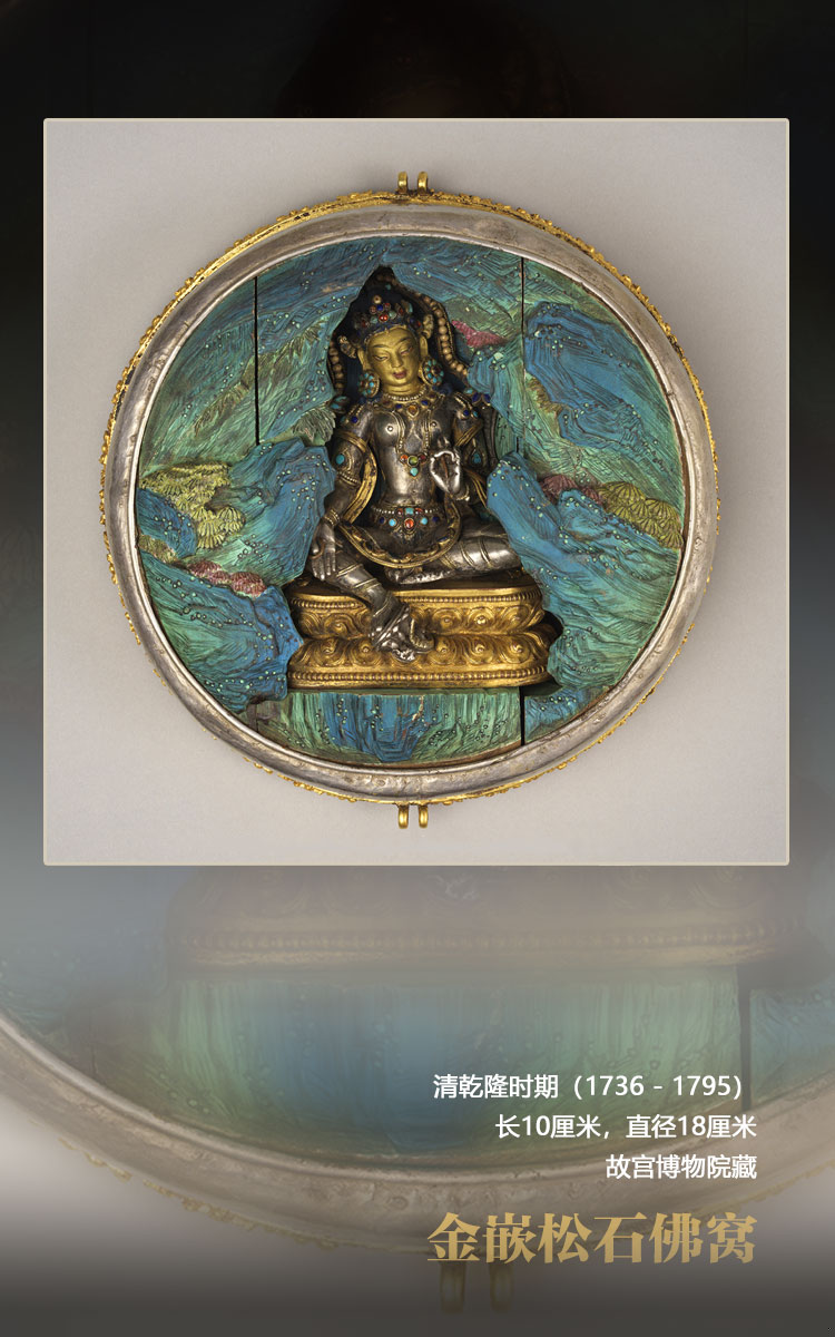 此佛窩九成金質(zhì),圓盒狀,金質(zhì)盒蓋上滿嵌梯形同心圓狀綠松石片,側(cè)面有三條松石鑲嵌的裝飾帶及蓮花紋圖案。盒蓋兩邊有可拆卸雙耳,可穿繩佩戴頸上,為護(hù)身佛盒。盒內(nèi)填染青綠木雕山洞,中間供有銀質(zhì)綠度母一尊。度母面部泥金,右手與愿印,左手說(shuō)法印,身上嵌綠松石、青金石、蜜蠟等,游戲坐于飾連珠紋和俯仰蓮瓣紋的金座上。附黃紙簽一張,上書(shū)漢、滿、蒙、藏四體文題記,漢文曰:“乾隆四十五年八月初七日,班禪額爾德尼恭?;噬掀哐f(wàn)壽,遞丹書(shū),呈進(jìn)大利益綠衣救度佛母古佛?!?此處“大利益”有大功德之意,根據(jù)銘文可知,這個(gè)佛窩應(yīng)是乾隆帝七十大壽時(shí)六世班禪敬獻(xiàn)的祝壽禮物。(文圖資料來(lái)源:澳門藝術(shù)博物館 中國(guó)西藏網(wǎng) 記者/易文文 趙佳 呂靜 王東 姚浩然)