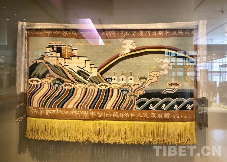 西藏自治區(qū)人民政府向澳門贈(zèng)送了一幅掛毯《山高水長(zhǎng)》。掛毯采用西藏傳統(tǒng)的藏毯工藝,以卷軸畫(huà)為表現(xiàn)形式,結(jié)合鮮艷、明快、大方、富有視覺(jué)張力的民族繪畫(huà)藝術(shù)制作而成,具有濃厚的藏族文化氣息。