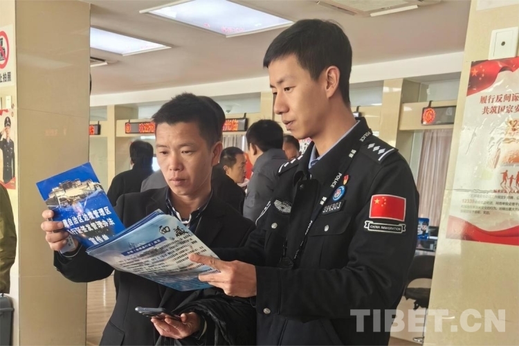 圖為西藏邊檢總站執(zhí)法調(diào)查支隊辦證室民警在西藏拉薩向群眾普及邊境管理區(qū)通行證管理辦法