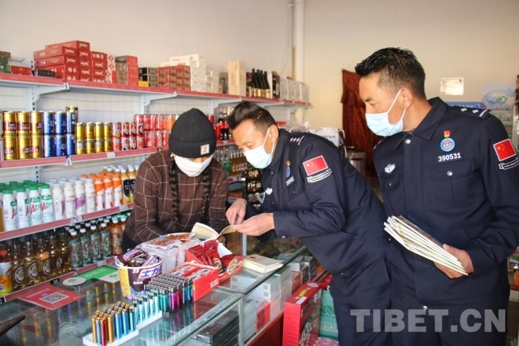 圖為西藏邊檢總站執(zhí)法調(diào)查支隊民警在西藏日喀則市定日縣商鋪宣傳國家安全知識
