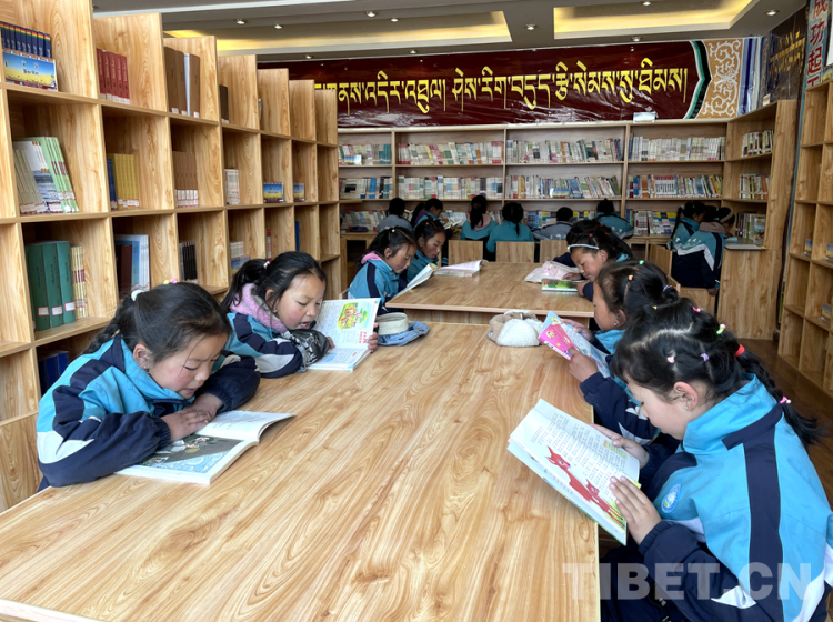 圖為4月23日,在西藏日喀則市薩迦縣雄麥鄉(xiāng)中心小學(xué)圖書館內(nèi),小學(xué)生們在閱讀書籍 攝影:頓珠次仁
