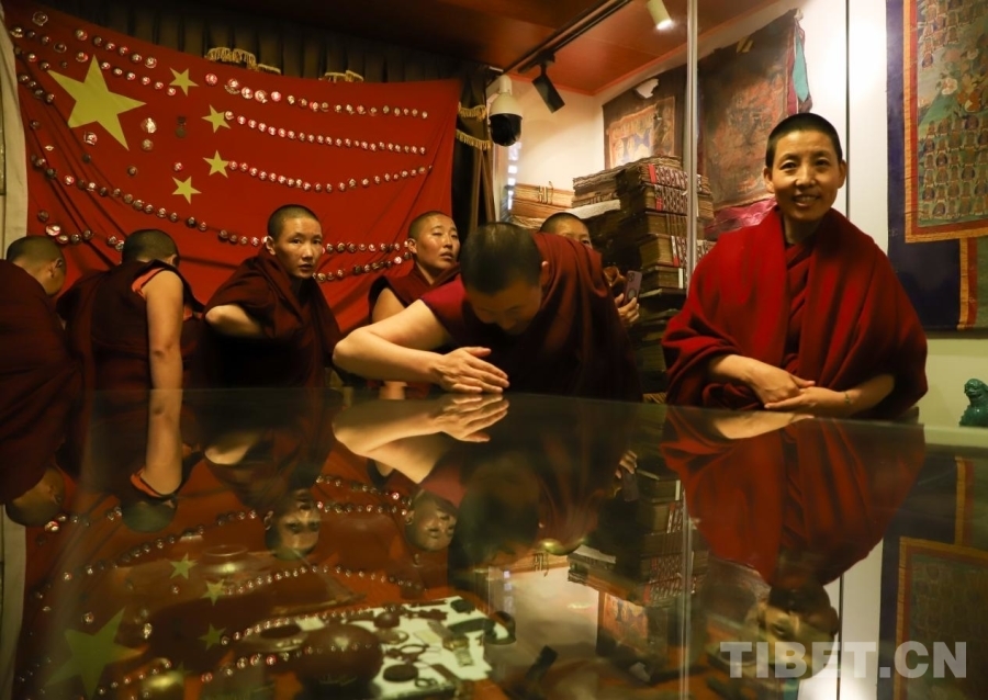 圖為尼眾在尼池拉康民族團結(jié)系列館參學(xué)