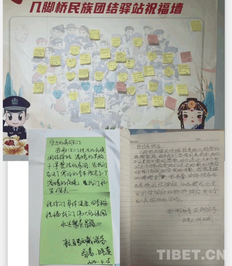 記者在社交媒體上也看到了很多游客以視頻、圖文等形式分享了他們和幾腳橋民族團(tuán)結(jié)驛站的故事?!耙?yàn)楫?dāng)?shù)靥厥庠蛭覀兊娇h城沒有地住了,在小紅書上看到這個驛站可以留宿,實(shí)在沒有辦法去邊防檢查站詢問。邊防小哥哥了解原因后特別暖心立馬給我們安排住宿,洗漱用品樣樣不差,太贊啦!這是我這一路旅行睡得最香的一晚,主要還免費(fèi)!”一位游客半調(diào)侃地分享了自己的故事,還加了三張夜拍驛站的圖片。一張用外景,在夜里,“幾腳橋民族團(tuán)結(jié)驛站”漢藏雙語大牌十分醒目;一張室內(nèi)環(huán)境,左右兩邊的上下鋪床上放著四個“豆腐塊”被子,床單潔白如新,中間的小桌子上還放著氧氣罐、雜志、臺燈等用品;一張貼滿祝福與感謝的“便簽墻”……張張圖片體現(xiàn)了驛站工作人員的用心良苦,也定格著他難忘的定結(jié)記憶。