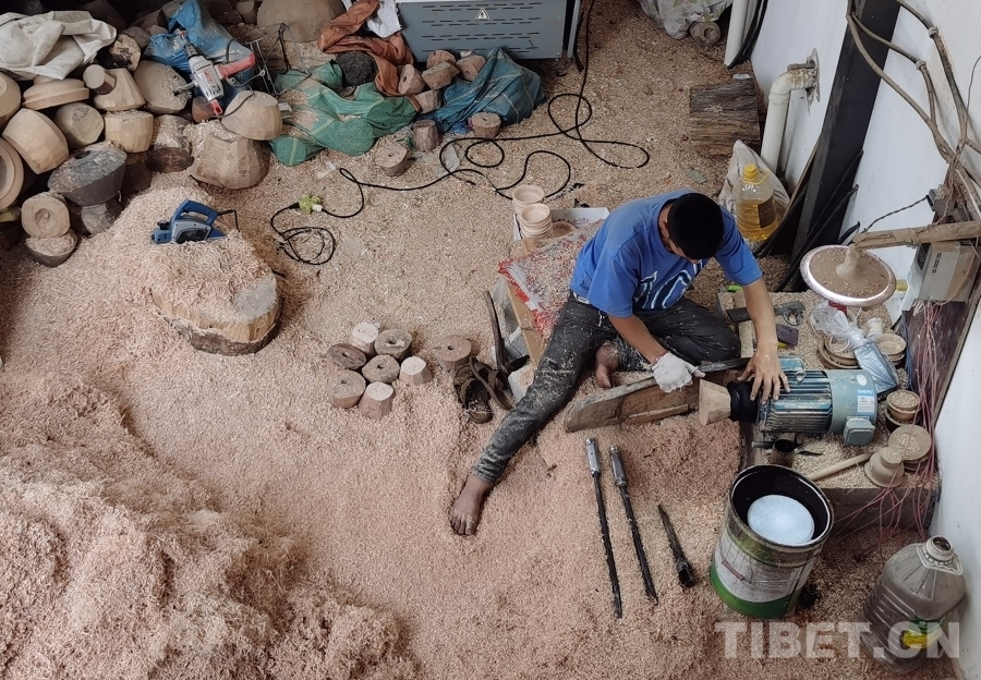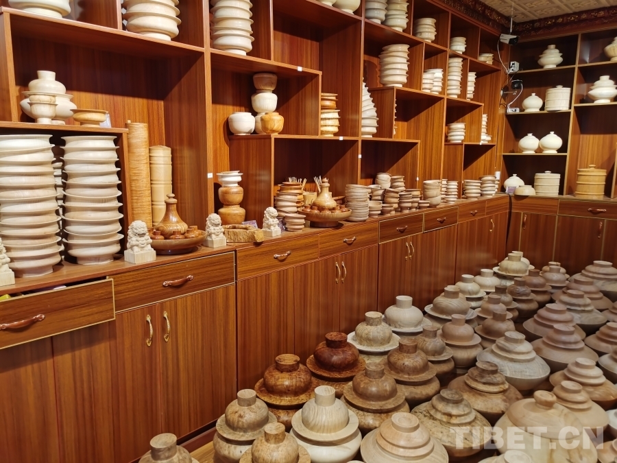 我們首先來到的是四川省非物質(zhì)文化遺產(chǎn)項(xiàng)目——藏族民間車模技藝體驗(yàn)基地。基地一層是工作區(qū),一位師傅正在全身心制作木質(zhì)生活用具,絲毫沒有察覺我們的到來。于是沒有過多打擾,我們徑直來到二樓展品陳列區(qū)。藏族民間車模技藝傳承人格絨次仁的兒子洛絨次仁拿起一個(gè)木碗,臉上露出樸實(shí)而靦腆的微笑介紹道,“這些都是選用樹瘤制作而成,一般選用鵝掌木、杜鵑等15類樹木,因?yàn)橹蹦救菀琢验_。為了用具不裂開,處理后的樹瘤煮水后需晾干五至六個(gè)月,一個(gè)木碗制作工序可能要長達(dá)半年才能完成。此項(xiàng)技藝在家族傳承至今已有四代,我們要做就做好一點(diǎn)。”洛絨次仁大哥希望更多人能了解這項(xiàng)非物質(zhì)文化遺產(chǎn),有更多人愿意來傳承學(xué)習(xí)這份技藝,有更多人喜歡他們制作的這些木質(zhì)生活用具。