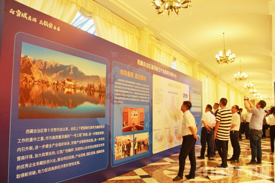 圖為西藏自治區(qū)通用航空產業(yè)招商引資推介會現(xiàn)場設置的展板吸引與會嘉賓駐足了解 攝影:劉莉