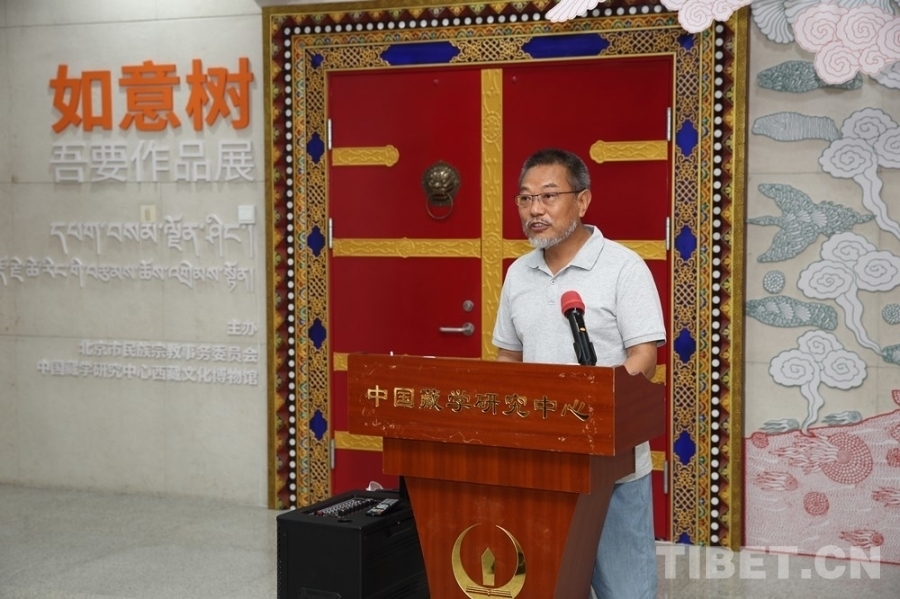 中國(guó)西藏網(wǎng)訊 7月5日,由北京市民族宗教事務(wù)委員會(huì)指導(dǎo)、中國(guó)藏學(xué)研究中心西藏文化博物館主辦的“如意樹(shù)——吾要作品展”在京開(kāi)幕。中國(guó)藏學(xué)研究中心有關(guān)負(fù)責(zé)人和專家學(xué)者、北京市民族宗教事務(wù)委員會(huì)有關(guān)負(fù)責(zé)人、書(shū)籍設(shè)計(jì)師吾要及北京藝術(shù)界人士等60余人出席開(kāi)幕式。