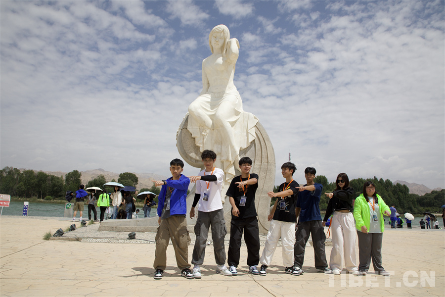 圖為香港交流團(tuán)青少年在貴德黃河少女雕塑前合影留念 攝影:桑吉