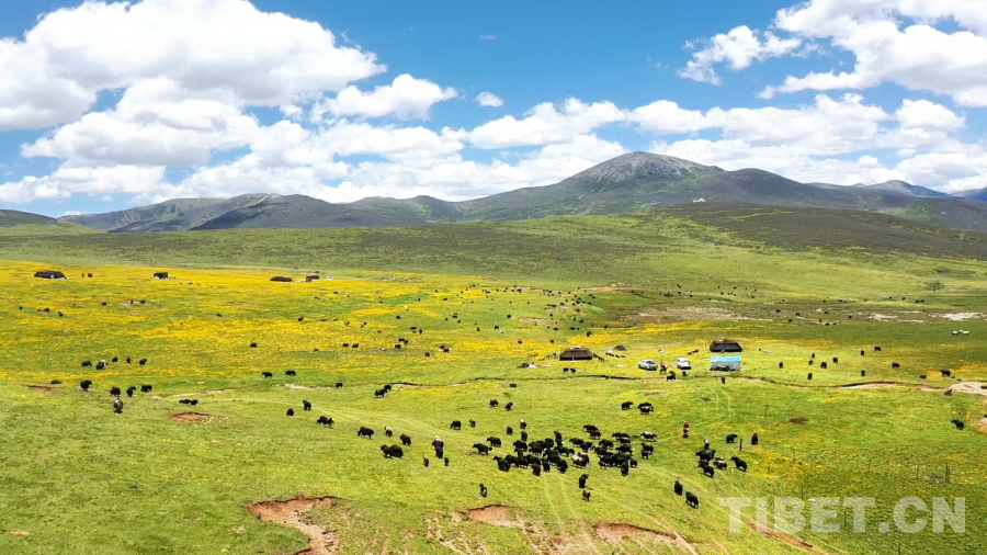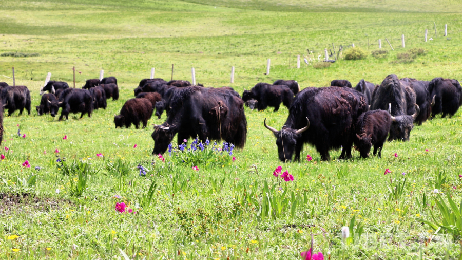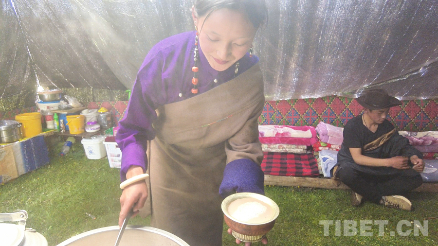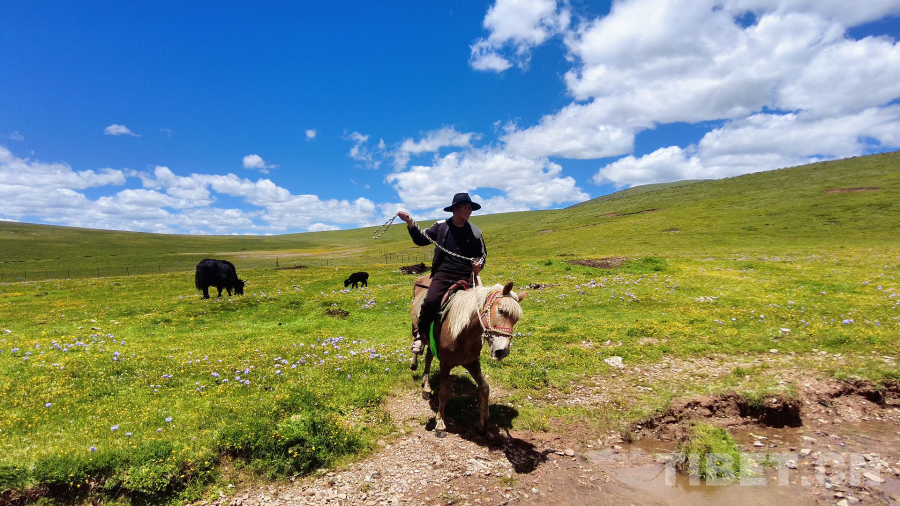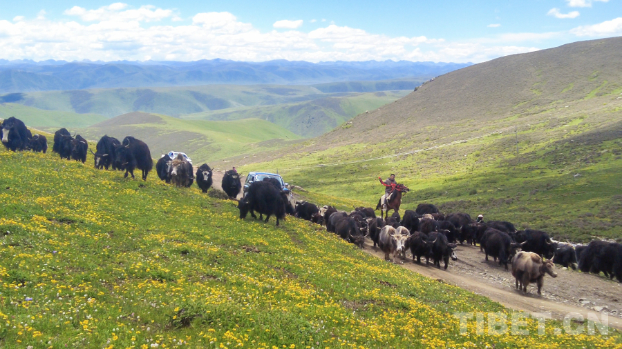 早晨天剛蒙蒙亮,他們就準(zhǔn)備出發(fā)了,一家人把生活必需品黑帳篷,火爐,鍋碗瓢盆,被褥及酥油糌粑等物資打包裝車,由家人先駕駛拖拉機(jī)把所有物資運(yùn)送到夏季遠(yuǎn)牧點,四郎彭措則和他的侄兒騎馬趕牛出發(fā)。冬季牧場到夏季牧場距離60公里,他們經(jīng)過9個小時的遷徙,終于在下午3點到達(dá)夏季牧場。此時他的家人也在鄰居的幫助下搭好了帳篷,煮好了酥油茶等待著他們。到了夏季牧場,牦牛們也迫不及待奔向了肥美的水草,四郎彭措和他的侄兒也終于可以卸下滿身的疲憊,品嘗家人們準(zhǔn)備好的美食。夏季牧場正是一年當(dāng)中最美的季節(jié),草原上開滿了五顏六色的花朵,多日不見的好友也帶著自己的家人早一步駐扎在此地,四郎彭措說道:“夏季放牧,轉(zhuǎn)場雖然辛苦,但也是一年中難得的閑暇時光。夏季水草肥美,牦牛們有充足的食物,來到夏季牧場放牧的牧民也有更多的活動時間,賽馬、唱歌、跳鍋莊舞是我最喜歡的活動。”
