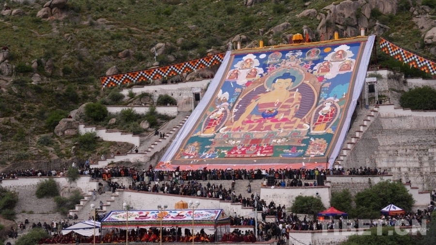 中國(guó)西藏網(wǎng)訊 8月4日,哲蚌寺背后的半山腰上,伴著莊嚴(yán)的法號(hào)聲,巨幅釋迦牟尼像唐卡緩緩展開(kāi),吸引著數(shù)以千計(jì)的信教群眾和來(lái)自世界各地的游客,場(chǎng)面蔚為壯觀。
