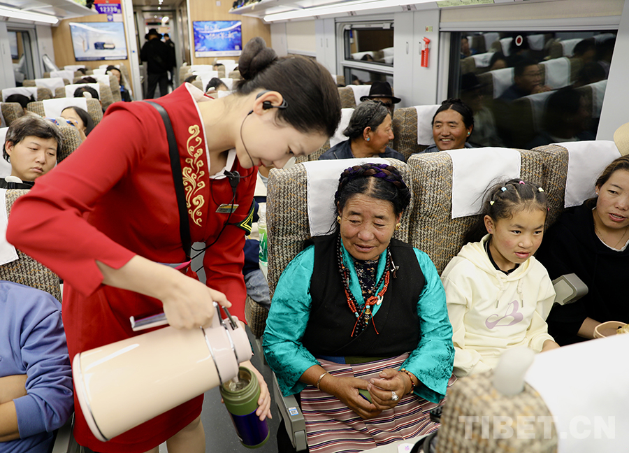 圖為拉日鐵路列車乘務(wù)員服務(wù)旅客 攝影:馬生明