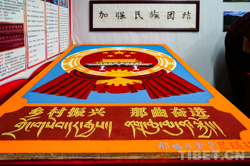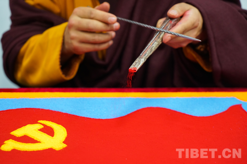 中國(guó)西藏網(wǎng)訊 2024年那曲恰青賽馬節(jié)暨第三屆“鄉(xiāng)村振興 那曲奮進(jìn)”活動(dòng)現(xiàn)場(chǎng),兩位來(lái)自那曲市索縣加勤鄉(xiāng)尼瑪林寺的僧人用彩砂繪制工藝?yán)L制黨徽、國(guó)旗、國(guó)徽等彩砂作品,深切表達(dá)藏傳佛教僧人愛黨愛國(guó)愛教之情,用實(shí)際行動(dòng)踐行聽黨話、感黨恩、跟黨走,加深信教群眾對(duì)于祖國(guó)的熱愛。