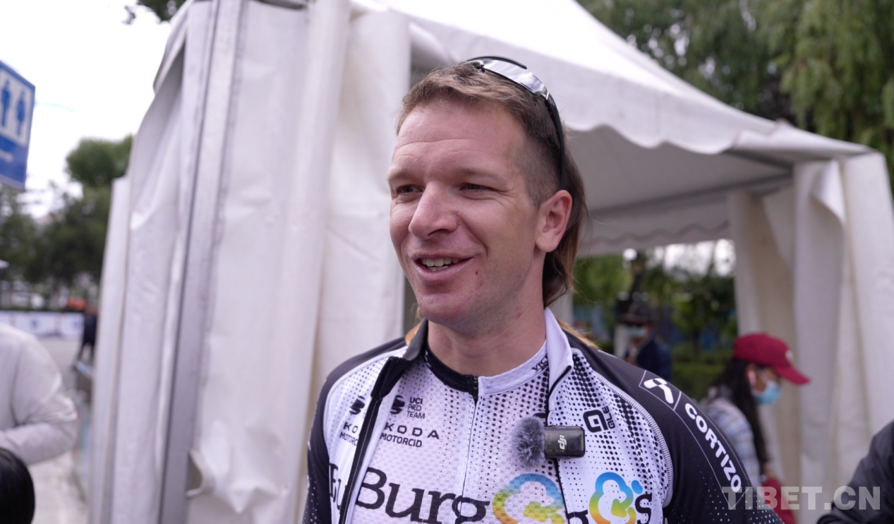 圖為拉薩繞圈賽第二名、來(lái)自布爾戈斯·BH職業(yè)隊(duì)的GATE Aaron Murray接受中國(guó)西藏網(wǎng)的采訪 攝影:德吉卓瑪