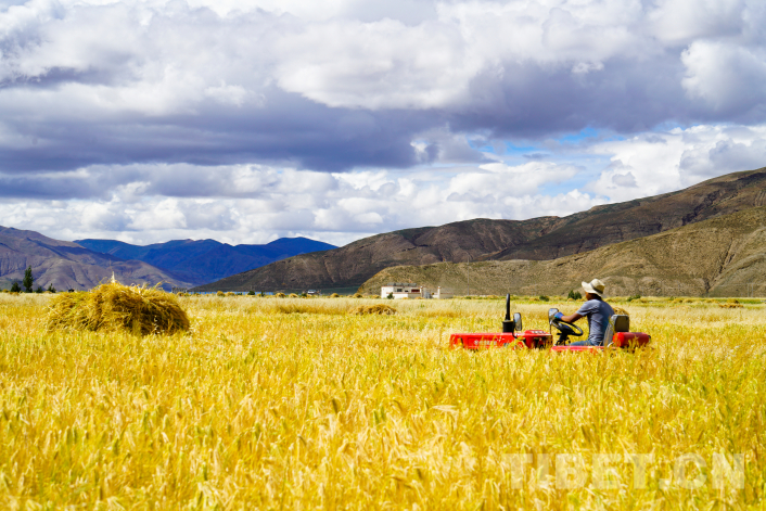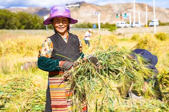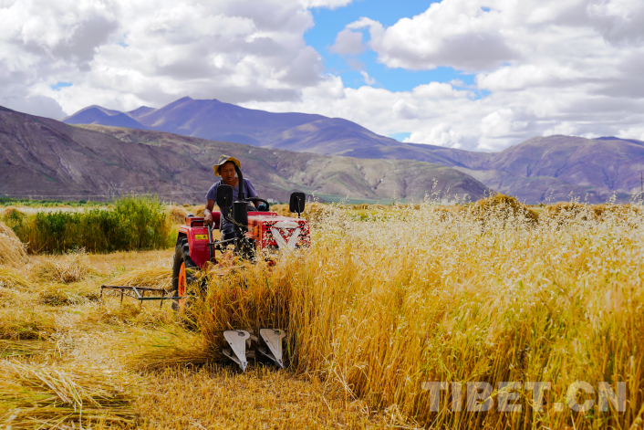飄香的秋日一片金黃,一臺臺收割機(jī)正在青稞田里往來穿梭。2023年,西藏青稞產(chǎn)量達(dá)84.36萬噸,播種面積達(dá)222.87萬畝,累計(jì)建成高標(biāo)準(zhǔn)農(nóng)田430萬畝,青稞良種覆蓋率達(dá)到93%,主要糧食作物耕種收綜合機(jī)械化率達(dá)到71%以上。