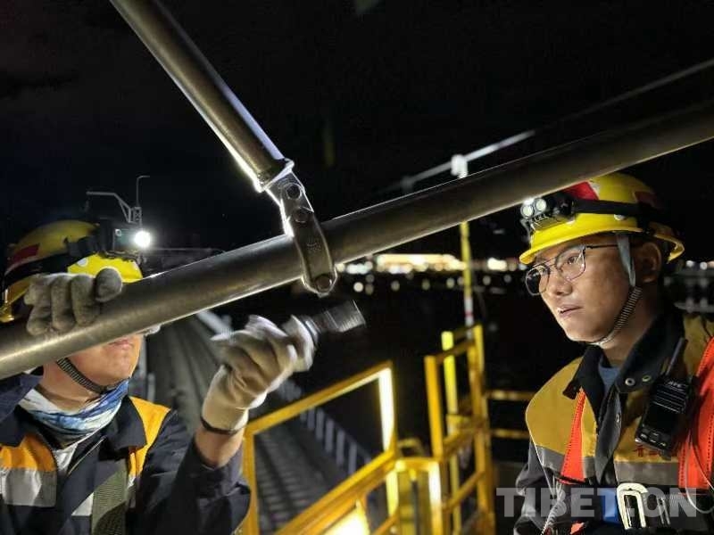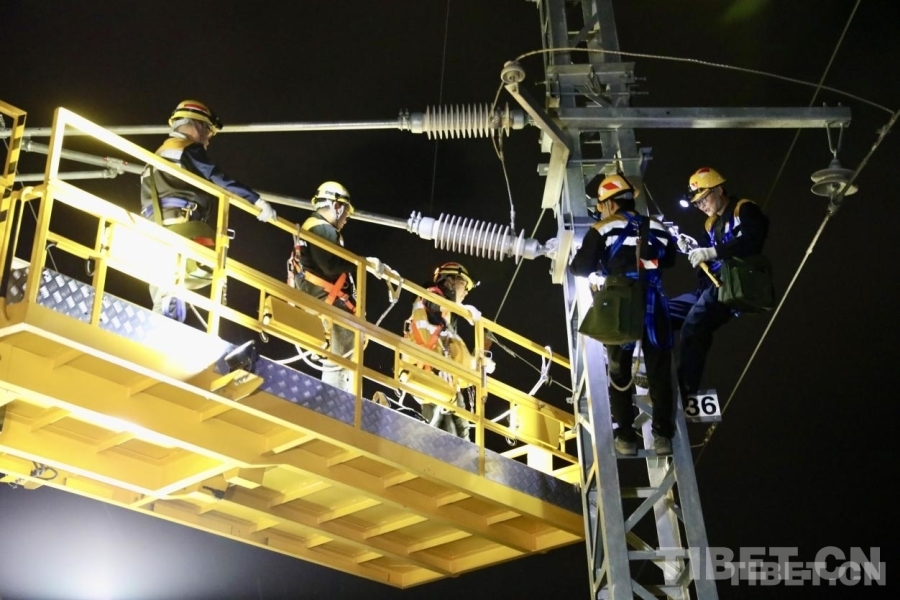 23時00分,軌道車穩(wěn)穩(wěn)??浚疤齑啊弊鳂I(yè)命令下達(dá)。中國鐵路青藏集團(tuán)有限公司拉薩基礎(chǔ)設(shè)施段供電維修技術(shù)中心拉薩南接觸網(wǎng)維修隊工長李積王帶著7名工友走下接觸網(wǎng)作業(yè)車,驗電、連接地線端、接掛地線……一系列操作一氣呵成。隨即,現(xiàn)場負(fù)責(zé)人拉加和工友們依次登上距離地面6米高的作業(yè)平臺上,穿梭于接觸網(wǎng)線索之間,猶如凌空“舞者”。