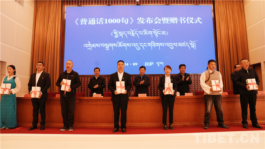 中國西藏網(wǎng)訊 為進(jìn)一步助力國家通用語言文字推廣普及,鑄牢中華民族共同體意識。9月20日,西藏自治區(qū)藏語委辦(編譯局)在拉薩舉行了《普通話1000句》漢藏對照版新書發(fā)布會(huì)暨贈(zèng)書儀式。西藏自治區(qū)政府副主席、自治區(qū)藏語委副主任甲熱·洛桑丹增出席會(huì)議,西藏自治區(qū)藏語委辦(編譯局)黨組副書記、主任(局長)達(dá)娃次仁作新書出版介紹,會(huì)上宣讀了教育部語文出版社發(fā)來的賀信,并向與會(huì)代表贈(zèng)書。
