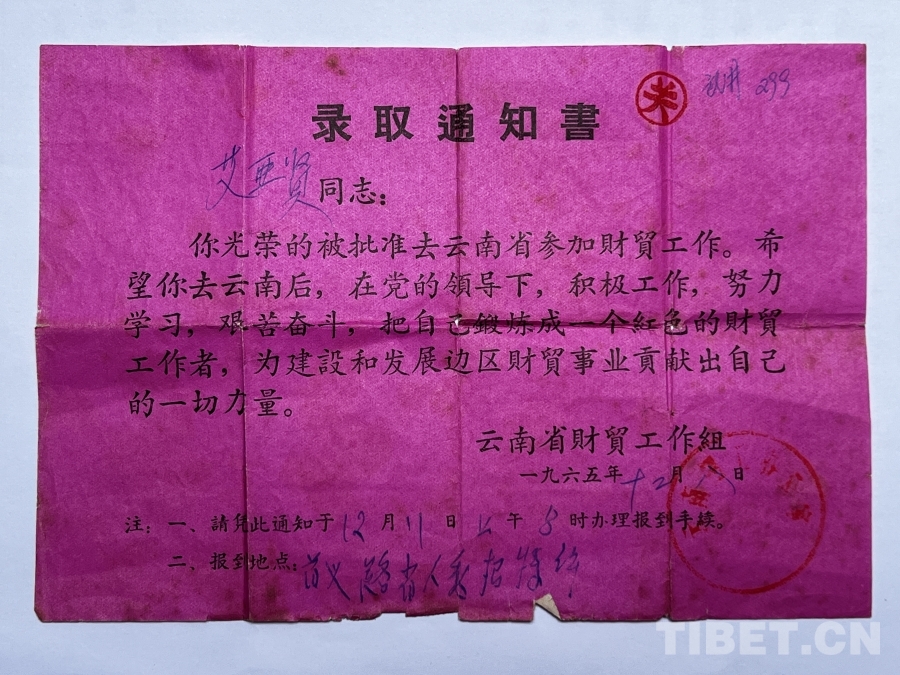 圖為1965年,云南省財貿(mào)工作組為訪談對象艾亞賢發(fā)的錄取通知書 供圖:李志農(nóng)