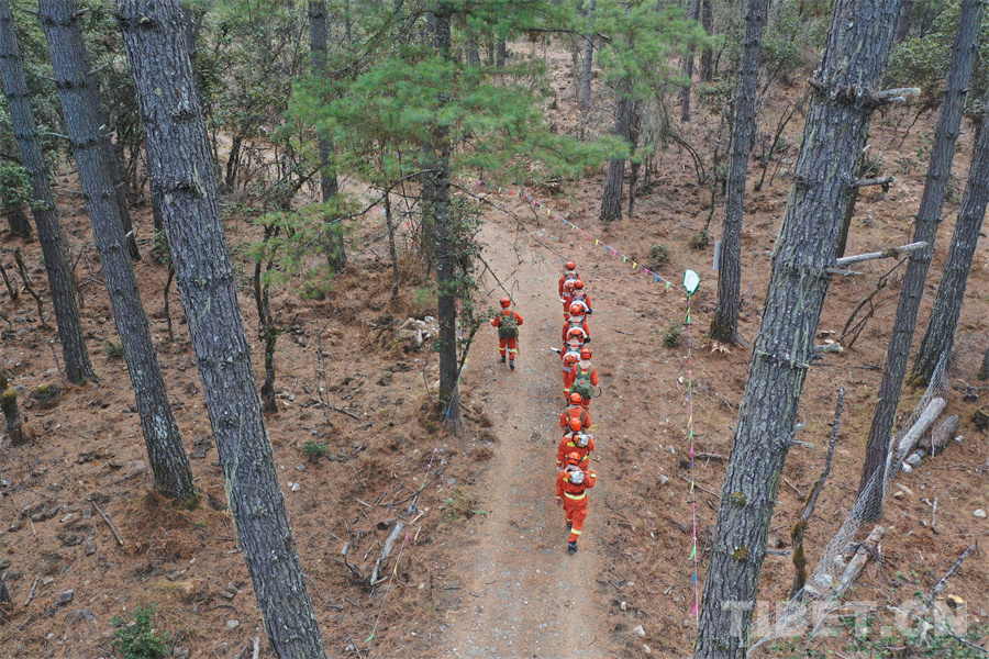 圖為森林消防員攜裝在林間巡護(hù)