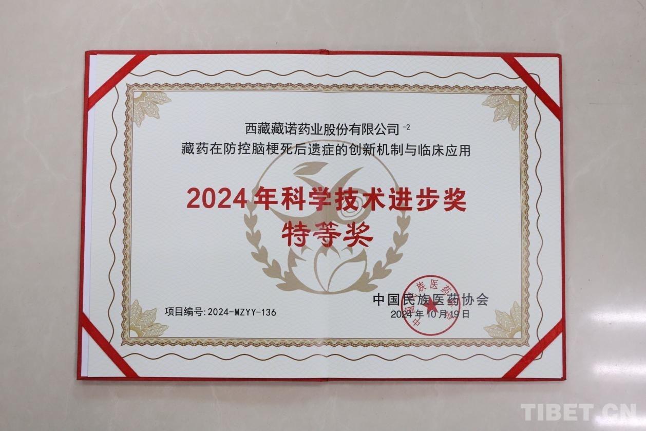 經(jīng)過(guò)申報(bào)、內(nèi)審和組織有院士、國(guó)醫(yī)大師等各民族專家組成的專家委員會(huì)初評(píng)、終評(píng)、公示、報(bào)備等環(huán)節(jié)和程序,由河北醫(yī)科大學(xué)第二醫(yī)院、西藏藏諾藥業(yè)股份有限公司、石家莊藏諾藥業(yè)股份有限公司聯(lián)合申報(bào)的《藏藥在防控腦梗死后遺癥的創(chuàng)新機(jī)制與臨床應(yīng)用》被授予“2024年中國(guó)民族醫(yī)藥協(xié)會(huì)科學(xué)技術(shù)進(jìn)步獎(jiǎng)”特等獎(jiǎng)。