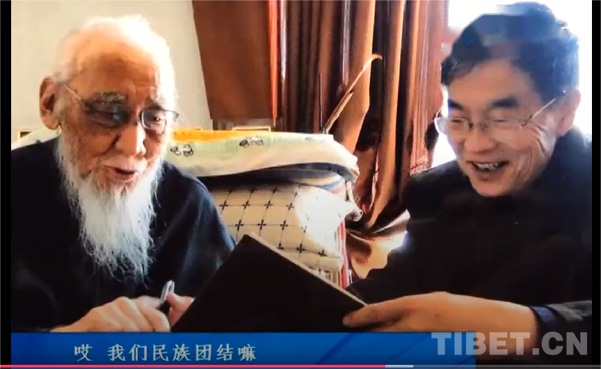 圖為恰白·次旦平措先生(左)與何宗英交流學(xué)術(shù)(視頻截圖) 作者供圖