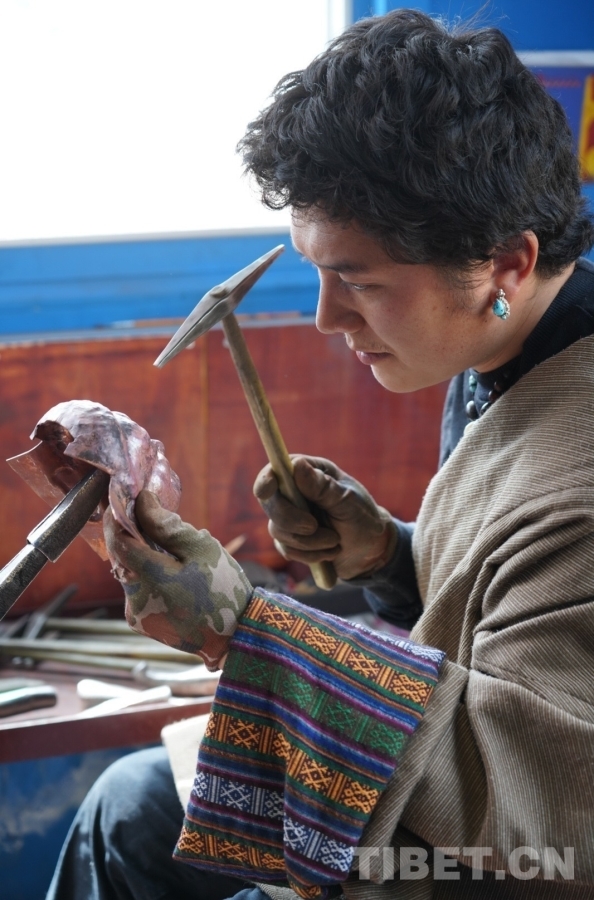 叮叮叮,叮叮?!し欢?,傳來一陣陣金屬敲擊的聲響。掀開門簾,一個小伙子坐在窗邊,右手拿錘,左手握著佛像架在細長的鐵器上,右手的錘子不停地敲擊著,左手也在一邊輕微轉動,目光緊緊鎖在眼前的佛像上柔和而堅定,古銅色的面龐與紅銅佛像仿佛在進行無聲的“對話”。