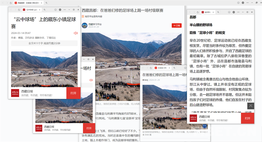 今年一月,延續(xù)七屆的馬利鎮(zhèn)足球“迎新杯”在“爸爸們修建的足球場”開賽的消息備受關注。一時間,《在爸爸們修建的足球場上踢一場村級聯(lián)賽》《“云中球場”上的藏東小鎮(zhèn)足球賽》《半山腰上的野球場 助推“足球小將”的蛻變》多篇稿件在China Daily、新華社、西藏日報、學習強國、昌都發(fā)布等平臺紛紛亮相,引起不少關注。