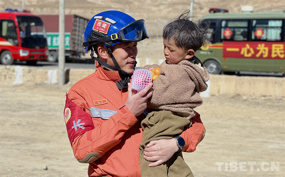 圖為救援人員為災區(qū)小朋友拿水果