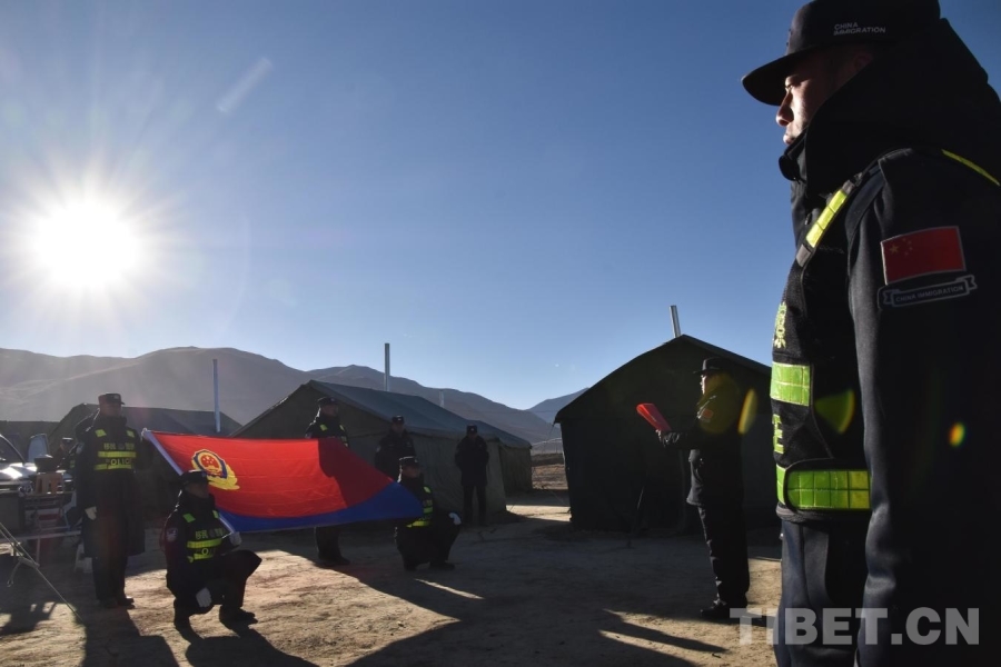圖為中國人民警察節(jié)當(dāng)天,在日喀則市定日縣長所鄉(xiāng)雜村安置點(diǎn),日喀則邊境管理支隊(duì)支隊(duì)長馬自防帶領(lǐng)安置點(diǎn)參與抗震救災(zāi)民警向警旗宣誓 攝影:崔娜