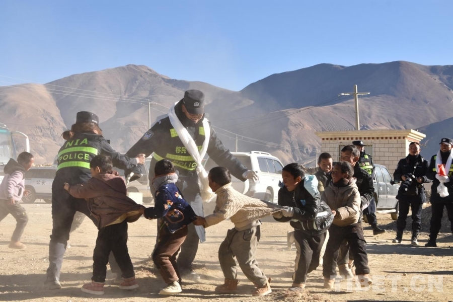圖為在日喀則市定日縣長所鄉(xiāng)雜村安置點(diǎn),移民管理警察和小朋友玩老鷹捉小雞游戲 攝影:卿光強(qiáng)