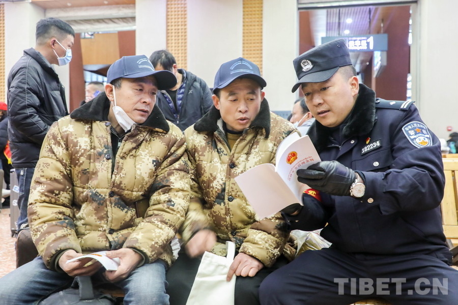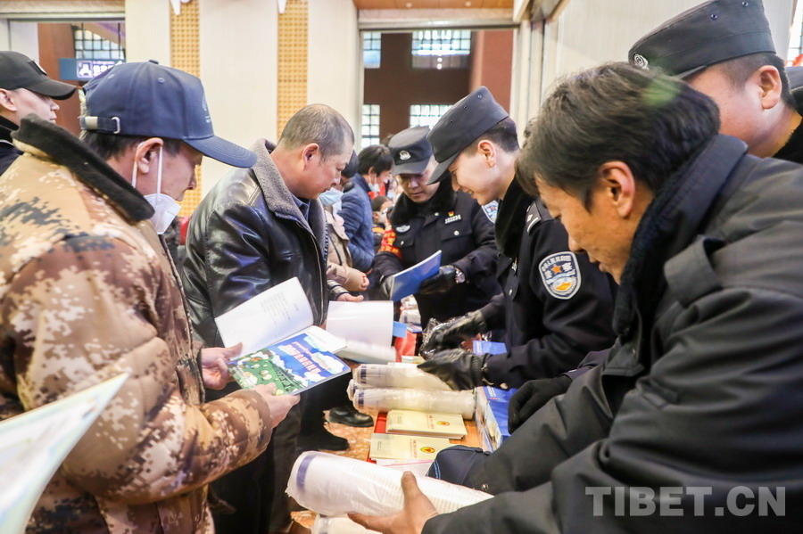 圖為春運(yùn)首日,西藏自治區(qū)司法廳聯(lián)合黨委政法委護(hù)路辦、拉薩鐵路公安處等單位在拉薩站區(qū)開展普法宣傳活動攝影:黃飛