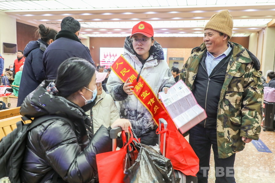 圖為西藏自治區(qū)司法廳人民調(diào)解宣傳員向在藏務(wù)工返鄉(xiāng)旅客講解相關(guān)法律常識攝影:黃飛