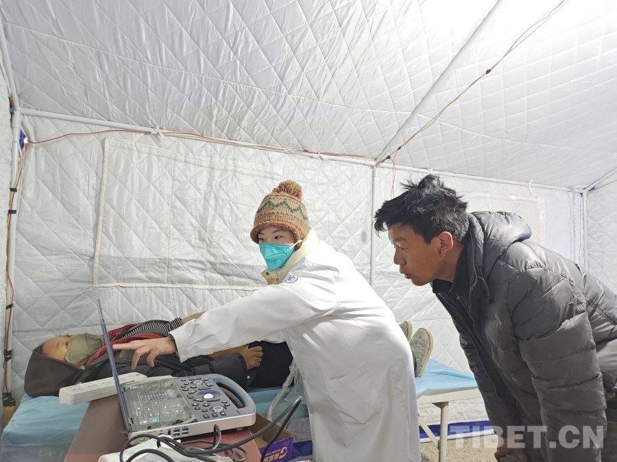圖為定日縣曲洛鄉(xiāng)仁果村阜康醫(yī)院臨時醫(yī)療點蹲點醫(yī)生全雄杰正在為小男孩看病