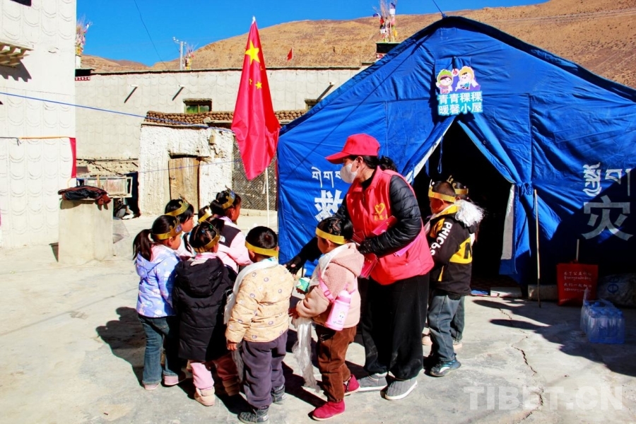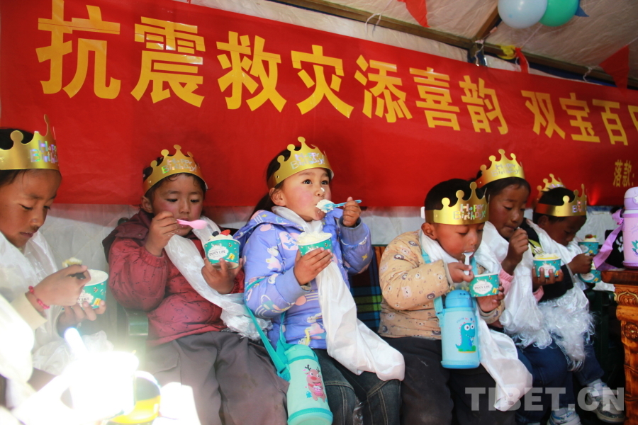 圖為西藏自治區(qū)日喀則市定結縣江嘎鎮(zhèn)榮貢村的小朋友們參加“情暖震后帳篷,共賀雙寶百日”活動 攝影:劉莉