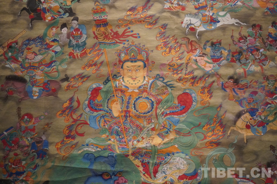 圖為清財神像唐卡局部。這幅主尊黃財神及八大馬王唐卡,主尊周圍生動地繪滿了傳統(tǒng)道教水陸畫中常見的人物形象,反映了古代青藏高原與河西走廊地區(qū)的文化交流,體現(xiàn)出我國多民族文化在邊疆地區(qū)的廣泛互動 攝影:張宇