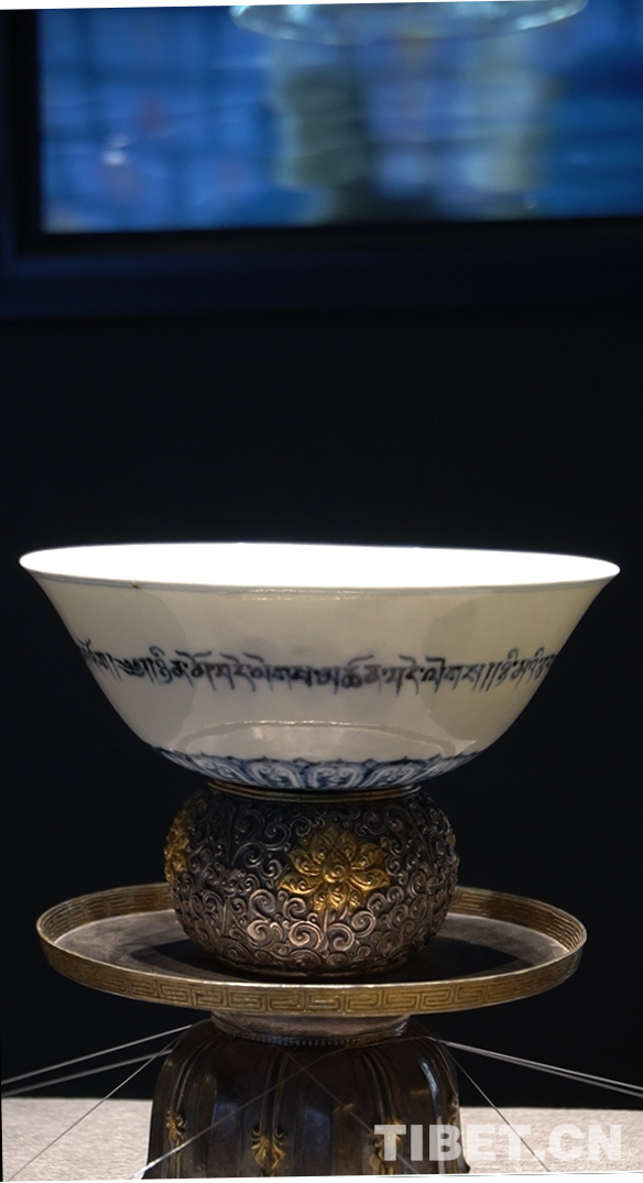 圖為“宣德年制”款青花藏文紋高足碗及銀鏨花紋碗座。高足碗是元代以來的重要瓷器樣式,這套高足碗外壁一圈書藏文吉語,大意為:日平安,夜平安,三寶永遠賜平安。碗下側(cè)高足外圈飾蓮花紋,碗底書有“宣德年制”款,并配有一套錯金銀簪花的碗托。風格的融合不僅讓這套高足碗擁有跨越地域的文化韻味,更引領(lǐng)著參觀游客探索與欣賞民族交往交流交融帶來的無限可能 攝影:張宇