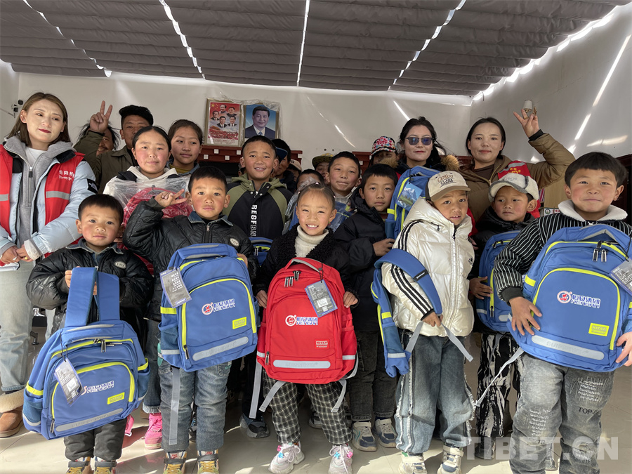 圖為西藏洛隆縣組織志愿者們?yōu)楹⒆觽冑浰蛯W(xué)習(xí)用具