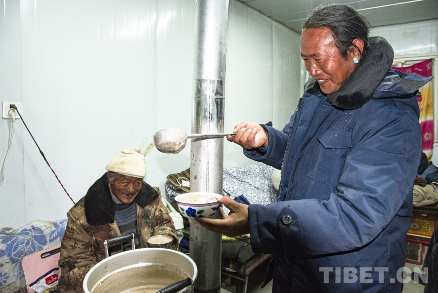 圖為日喀則市定日縣長所鄉(xiāng)茶江村村民扎西正在盛出熱氣騰騰的“古突” 攝影:趙振宇