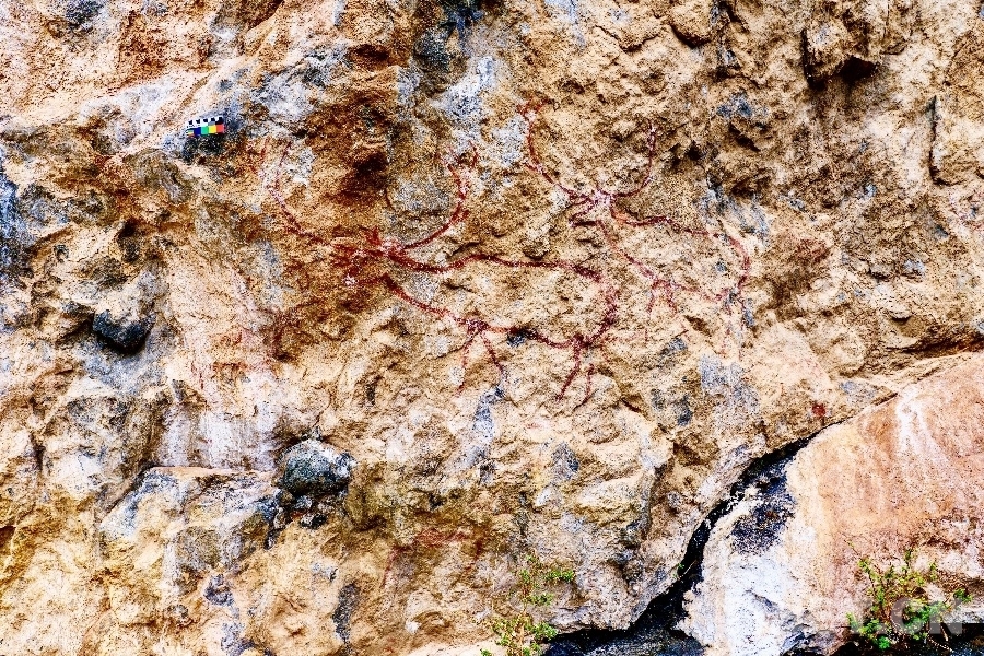 2023年在甘孜州文旅局的邀請下,我和張亞莎老師還有其他學(xué)者組織了一個比較大的團(tuán)隊(duì),開始對甘孜州巖畫做正式調(diào)查。甘孜州的巖畫一類是石刻類巖畫,一般歸到新石器時代;一類是更加珍貴的涂繪類巖畫,一般歸到舊石器時代。整個青藏高原250多萬平方公里的區(qū)域里,能夠確定年代、且能夠系統(tǒng)化深入研究的舊石器巖畫在當(dāng)時還是空白,這種線索就非常重要。